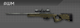 AWM - снайперская винтовка из разряда "болтовок". Обладает большим уроном, но не достаточным для стабильного убийства с одного попадания. Безусловный плюс винтовки в том, что ею можно завладеть на начальных уровнях игры из коробки удачи за варбаксы. Уступает по некоторым характеристикам Alpine, аналогичной винтовке данного класса, кроме скорострельности.